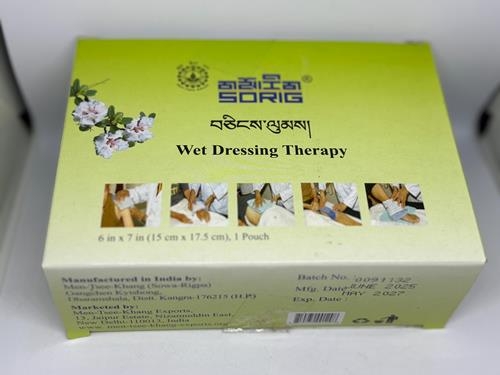 This Wet Dressing Therapy is formulated in accordance with the Tibetan Science of Healing. It is indicated for general Loong disorders and specifically effective against stiffness and contraction of the nerves, tendons and ligaments. It helps alleviate swelling and pain in the backbone, knees and other joints as well as control progressive weakness and muscle loss. It is also recommended for skin diseases and swelling of chronic amp acute wounds.